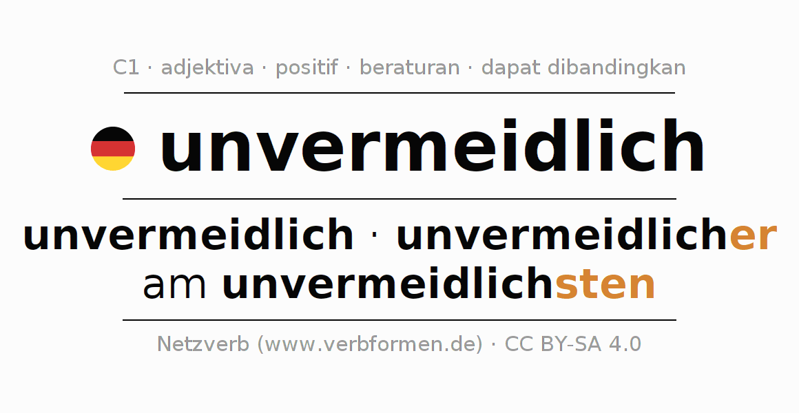 Deklinasi kata sifat unvermeidlich (tak terelakkan, tidak bisa dihindari) menggunakan bentuk perbandingan unvermeidlich,unvermeidlicher,am unvermeidlichsten. Akhiran untuk komparatif dan superlatif adalah er/sten. Adjektiva unvermeidlich dapat digunakan baik secara atributif di depan kata benda maupun secara predikatif bersama dengan kata kerja.Di sini, Anda tidak hanya dapat mengubah bentuk dan membandingkan unvermeidlich, tetapi juga semua kata sifat Jerman. Komentar ☆